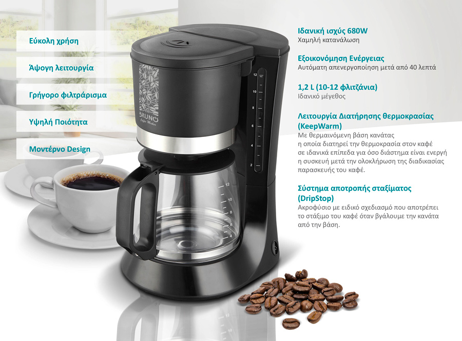 Καφετιέρα φίλτρου εξαιρετικής απόδοσης της Bruno με ισχύ 680W και χωρητικότητα 1,2lt.