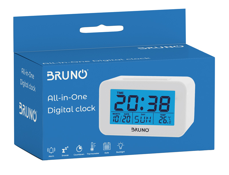 BRUNO ξυπνητήρι με μεγάλη ευανάγνωστη οθόνη και μέτρηση θερμοκρασίας. Υποστηρίζει λειτουργία αντίστροφης μέτρησης και λειτουργία snooze. Διαθέτει οπίσθιο φωτισμό με το πάτημα ενός κουμπιού.