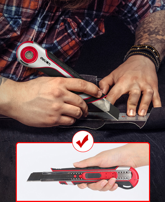Κοπίδι υψηλής ποιότητας της Deli, με πλατιά, ανθεκτική λεπίδα, ιδανικό για την κοπή χαρτιών και χαρτονιών. Έχει εργονομική, αντιολισθητική λαβή για σταθερό και ασφαλές κόψιμο, και διαθέτει αυτόματο σύστημα κλειδώματος της λεπίδας. Επιπλέον, εξοπλίζεται με κουμπί άμεσου ανοίγματος της λεπίδας με αυτόματη επαναφορά της στην αρχική θέση. Η λεπίδα του χωρίζεται σε 8 μέρη, ώστε, αφαιρώντας το φθαρμένο άκρο, να έχετε φρέσκια λεπίδα ξανά.