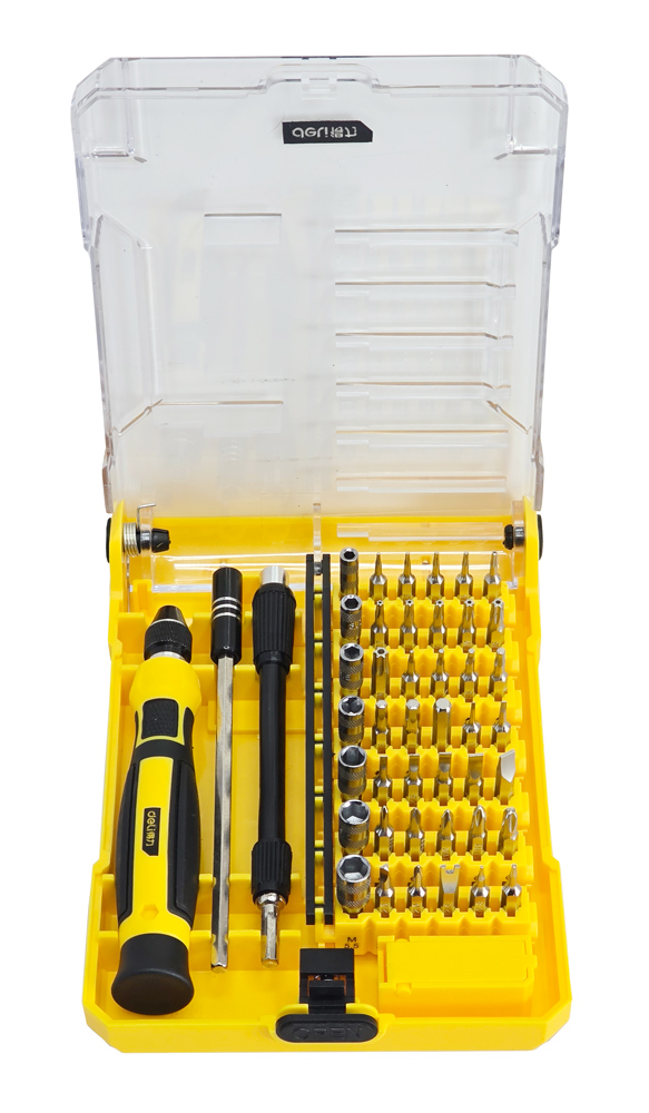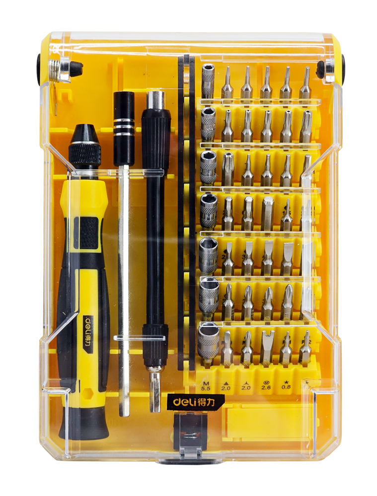 Σετ της Deli το οποίο αποτελείται από 1 κατσαβίδι, 2 αντάπτορες επέκτασης και 42 διαφορετικές μύτες κατσαβιδιού.