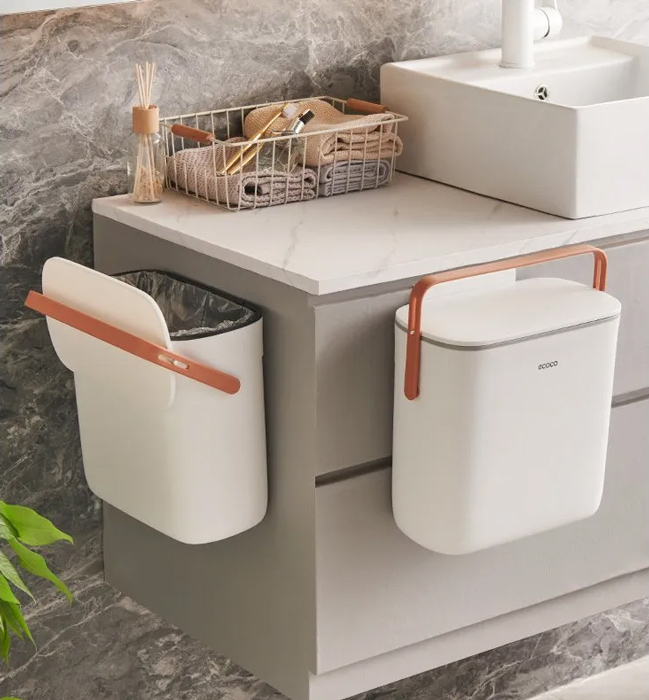Πλαστικός κάδος απορριμμάτων για να διατηρείτε την κουζίνα σας πάντα ταχτοποιημένη από την Ecoco. Η τοποθέτηση του μπορεί να γίνει με 2 τρόπους, είτε κρεμώντας το από ντουλάπια είτε σε επίπεδη επιφάνεια με αυτοκόλλητο.