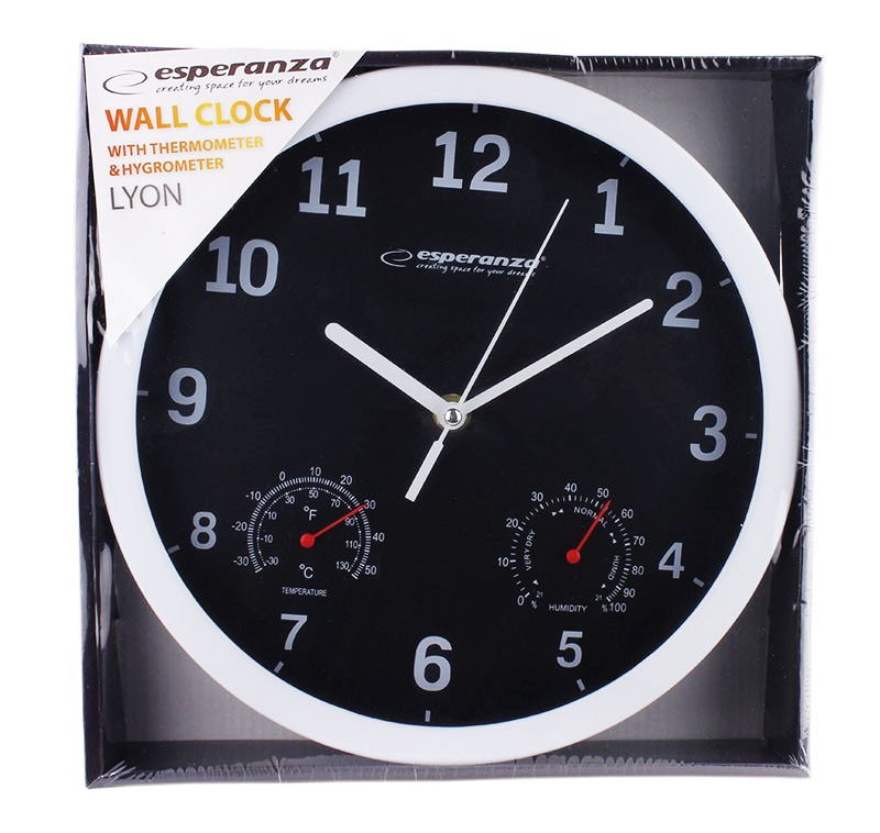 Το ρολόϊ τοίχου Esperanza Lyon EHC016K δεν χρησιμεύει μόνο στο να δείχνει την ώρα, μπορεί επίσης να μετρήσει την θερμοκρασία και την υγρασία του περίγυρου.