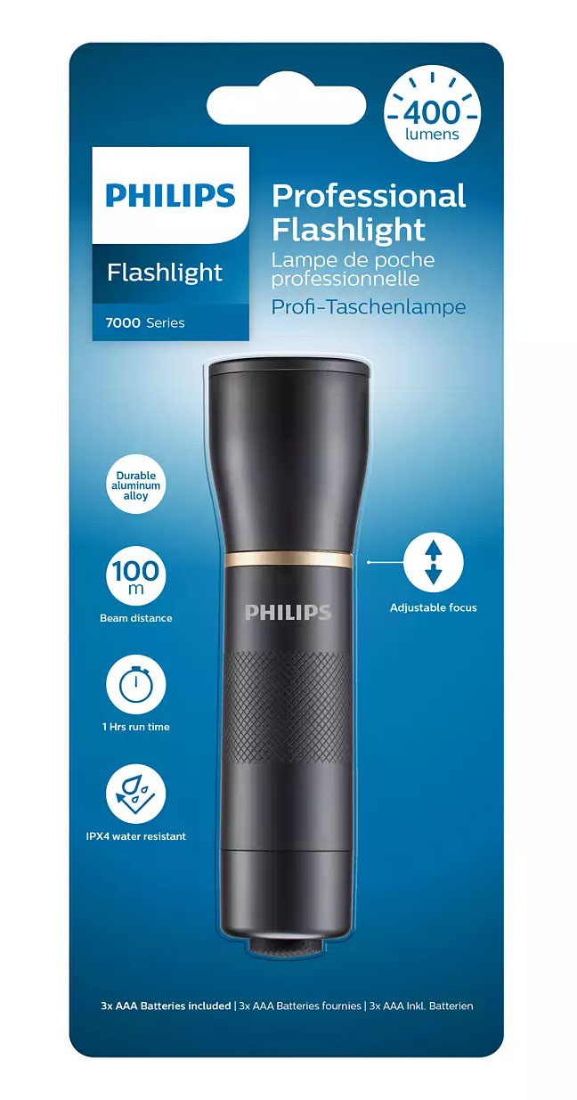 Ο επαγγελματικός φακός SFL700T-10 της Philipsπροσφέρει φως μεγάλης διάρκειας, για επαγγελματικές αλλά και καθημερινές εργασίες. Χρησιμοποιώντας την τεχνολογία LED παρέχει 400 lumens φωτισμού με ελάχιστη κατανάλωση μπαταρίας, σε σύγκριση με τους συμβατικούς φακούς. Φτιαγμένος απο ανθεκτικό κράμα αλουμινίου και αδιαβροχοποίηση με πιστοποίηση IPX4, αντέχει ακόμη και σε αντίξοες συνθήκες εργασίας. Η ακτίνα φωτός έχει εμβέλεια έως τα 100 μέτρα και ο ρυθμιζόμενος δακτύλιος εστίασης προσαρμόζει το μέγεθος της ακτίνας στα μέτρα σας. Τροφοδοτείται με 3 ΑΑΑ μπαταρίες (συμπεριλαμβάνονται), οι οποίες προσφέρουν αυτονομία έως και 1 ώρα συνεχούς χρήσης. Ελαφριά κατασκευή για να τον έχετε πάντοτε μαζί σας.