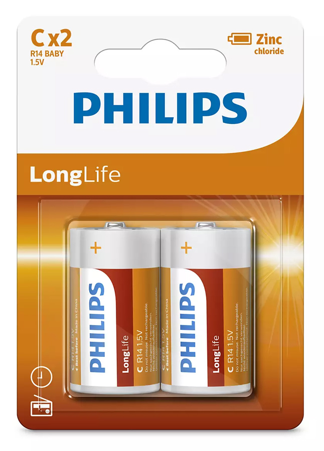 PHILIPS LongLife Zinc chloride μπαταρίες R14L2B/10, R14 1.5V, 2τμχ