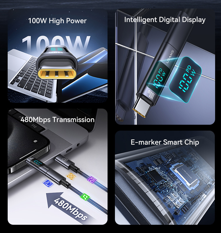 Aντάπτορας USB-C σε USB-C της Usams με οθόνη προβολής της απόδοσης φόρτισης σε πραγματικό χρόνο. Υποστηρίζει φόρτιση με απόδοση έως 100W.